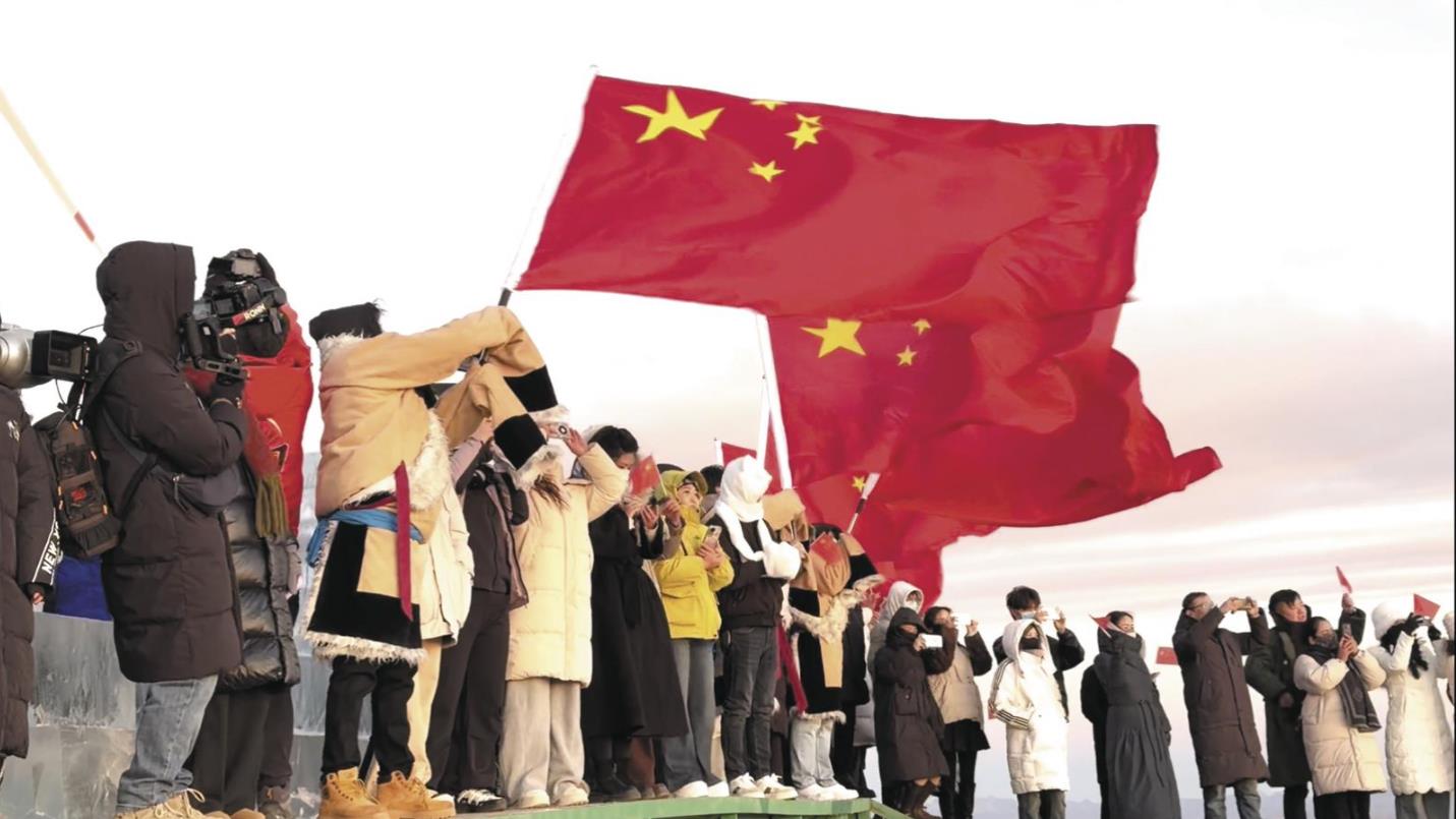 天气虽寒,山上依然有不少游客。来自西宁的00后大学生张宇与同学们一起,正在拍摄山上的雪景。“我们早上5点钟就到了,同宝山的日出太震撼了!站在先辈守护过的地方,看着太阳徐徐升起,身边的红色遗址和壮丽湖景让我真切感受到了‘热爱祖国、无私奉献’的深刻内涵。”张宇的脸颊冻得通红,眼神却格外坚定。