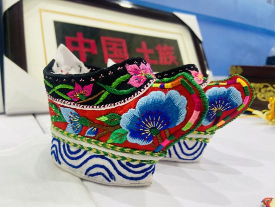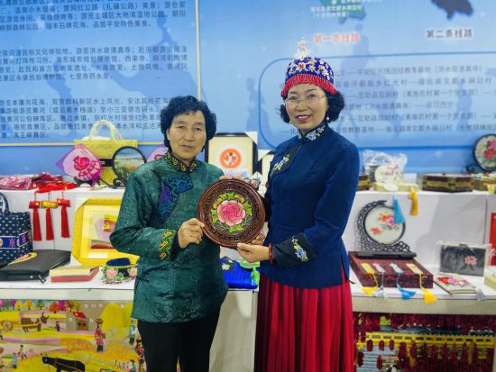 来自民和县三川地区的绣娘鄂结子正在海东展馆现场作业,身着土族服饰、凝神穿针引线的场景,在人头攒动的展馆成为一道独特的风景线。