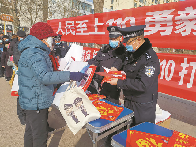 民警向群众发放“110”宣传品。青海省公安厅供图