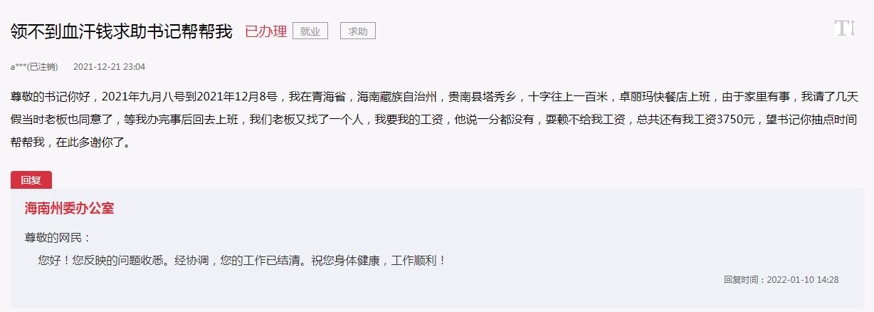 收到留言后,海南州委办公室协调相关部门解决了此事,并回复:“经协调,您的工资已结清。”