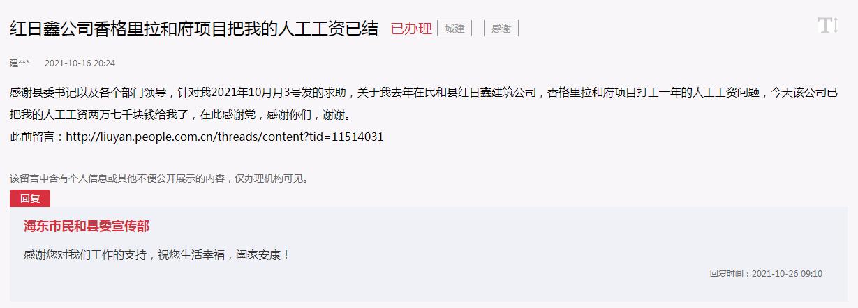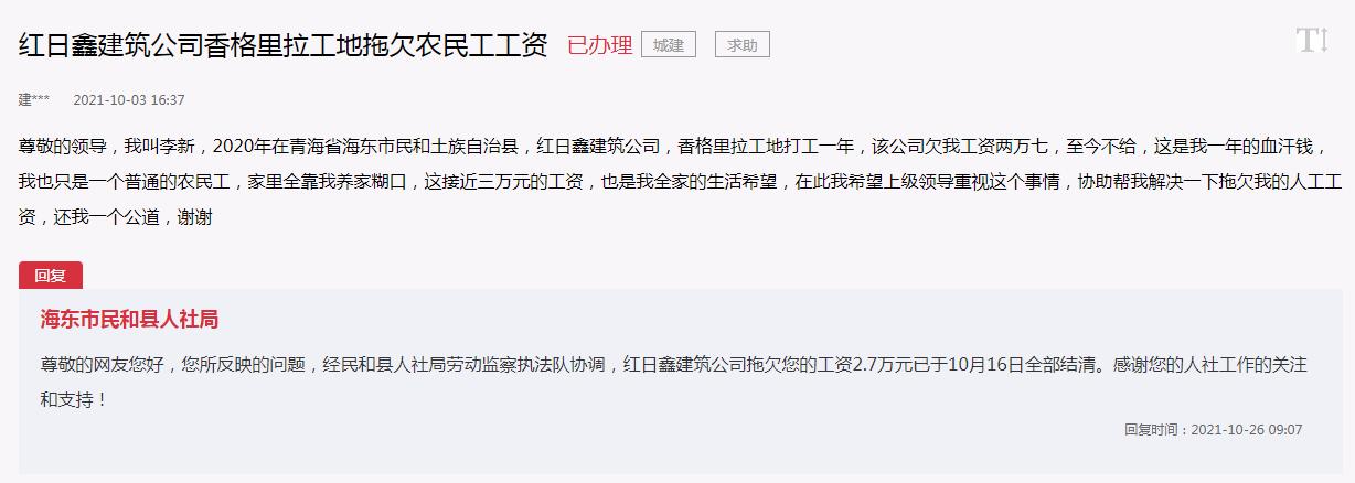 随后,青海省海东市民和县人社局回复该网友称:经民和县人社局劳动监察执法队协调,红日鑫建筑公司拖欠工资2.7万元已于10月16日全部结清。该网友也通过留言表示,拖欠工资已结清。
