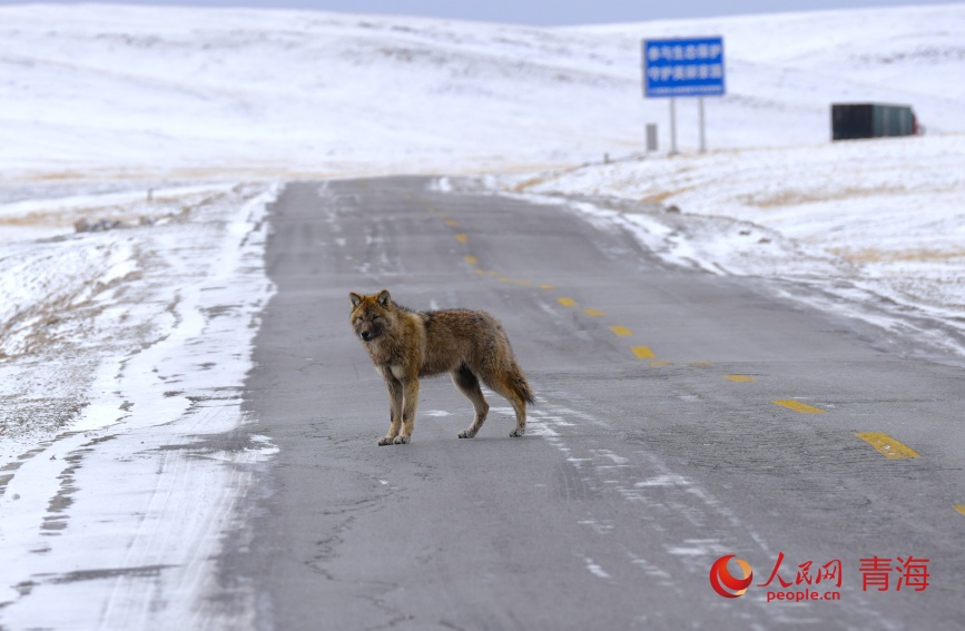 一只狼在109国道不冻泉附近。人民网记者 甘海琼摄