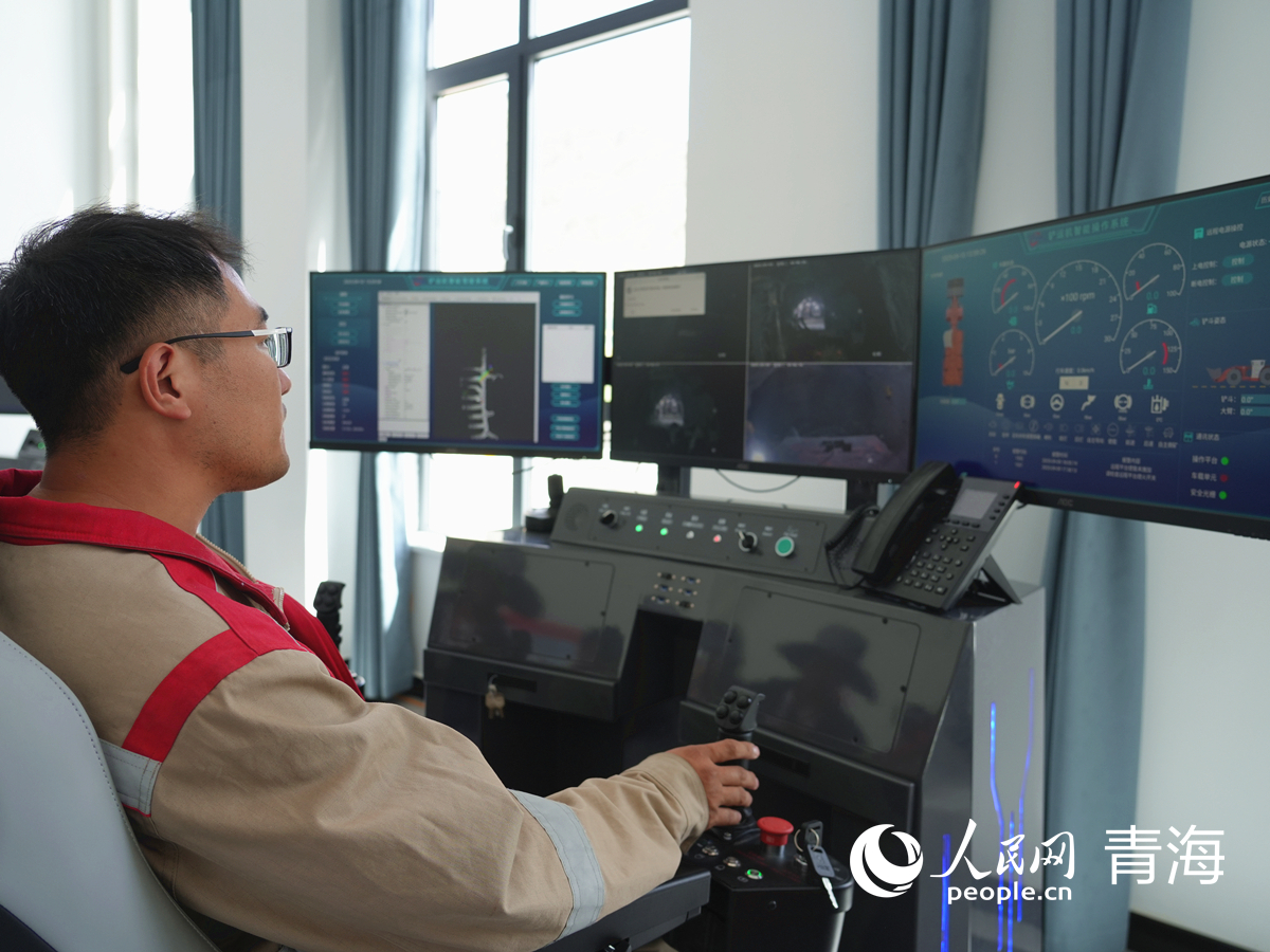 工作人员操作铲运机智能操作系统,该系统可远程操作铲运机在矿井下作业。人民网记者 杨启红摄
