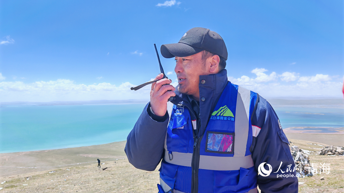 三江源国家公园黄河源园区的生态管护员格日杰布在海拔4610米的措哇尕则山顶峰巡护。人民网记者 杨启红摄