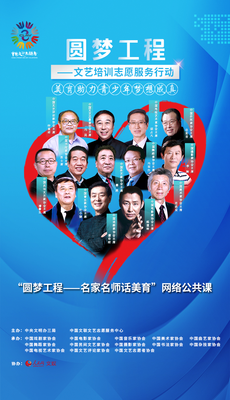 “圆梦工程——名师名家话美育”网络公共课共计13场,将于8月陆续推出。届时,包括中国杂技家协会主席边发吉、中国民间文艺家协会主席潘鲁生、中国摄影家协会主席李舸、中国书法家协会主席苏士澍、中国曲艺家协会副主席叮当、中国电视艺术家协会副主席王丽萍、中国戏剧家协会副主席冯玉萍、中国文艺评论家协会副主席王一川等在内的音乐、美术、书法、舞蹈、电影、戏剧等各领域专家将就自己的专业领域,亲自为网友授课。