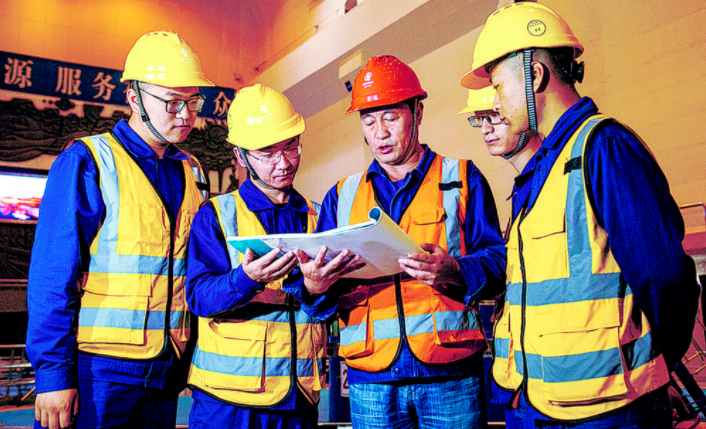 水电站工作人员检修水电机组。