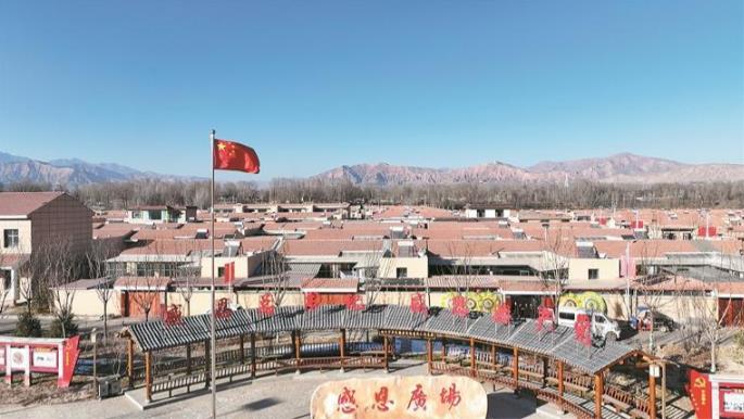 在民和县中川乡金田草滩新村的感恩广场上,鲜艳的五星红旗迎风飘扬。休闲长廊的棚顶上,“感恩总书记,感恩共产党”十个鲜红大字,在冬日阳光下显得格外温暖。