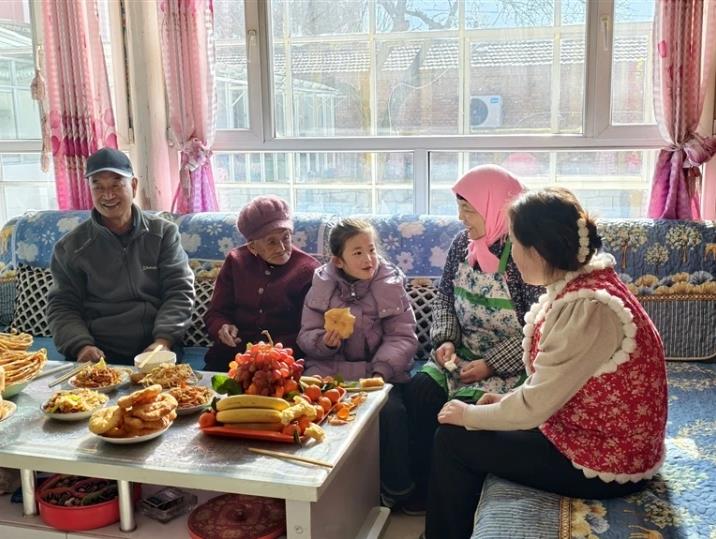 堂屋的沙发上,90岁高龄的鲍玉胜母亲精神矍铄,眯着眼睛看着忙碌的儿孙们,嘴角始终挂着笑意。8岁的刘文妍是家里最小的成员,她正悄悄和太奶奶说着什么,小脸上满是兴奋。提到即将到来的新年,小姑娘眼睛亮晶晶的:“我最盼着过年了,能穿新衣服、拿压岁钱,还能和小伙伴们一起玩‘抓人’游戏,可开心了!”