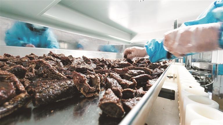 走进尖扎县伊丰肉食品加工包装销售有限公司的牦牛肉干加工车间,肉香扑鼻,机器隆隆作响,工人们身着统一工装,在洁净的生产线上有条不紊地忙碌着。“我们实行订单式生产。客户下单后,我们一周内生产发货,这些产品大多是昨天刚做出来的。”公司负责人马成良指着刚包装好的产品说。