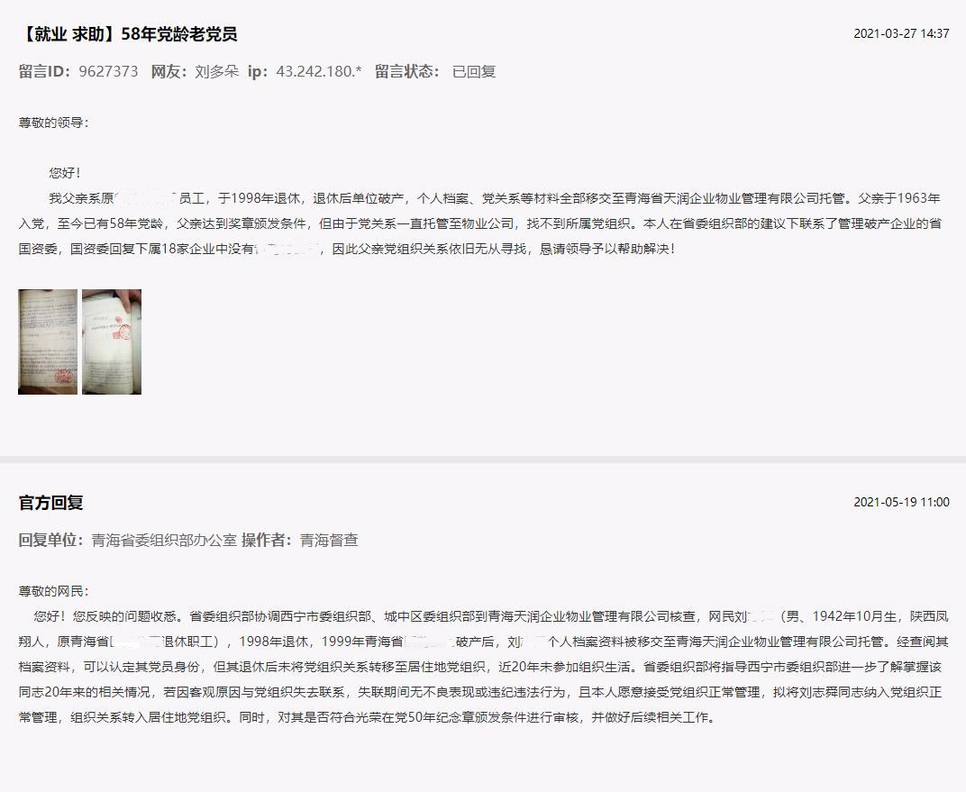 原来,该网友的父亲于1963年入党,退休后由于原单位破产,找不到所属党组织。青海省委办公厅在收到网友留言后,立即协调青海省委组织部、西宁市委组织部以及留言网友所在社区,经过两个多月的奔波协作,终于让这位58年党龄的老党员回归到党组织大家庭。