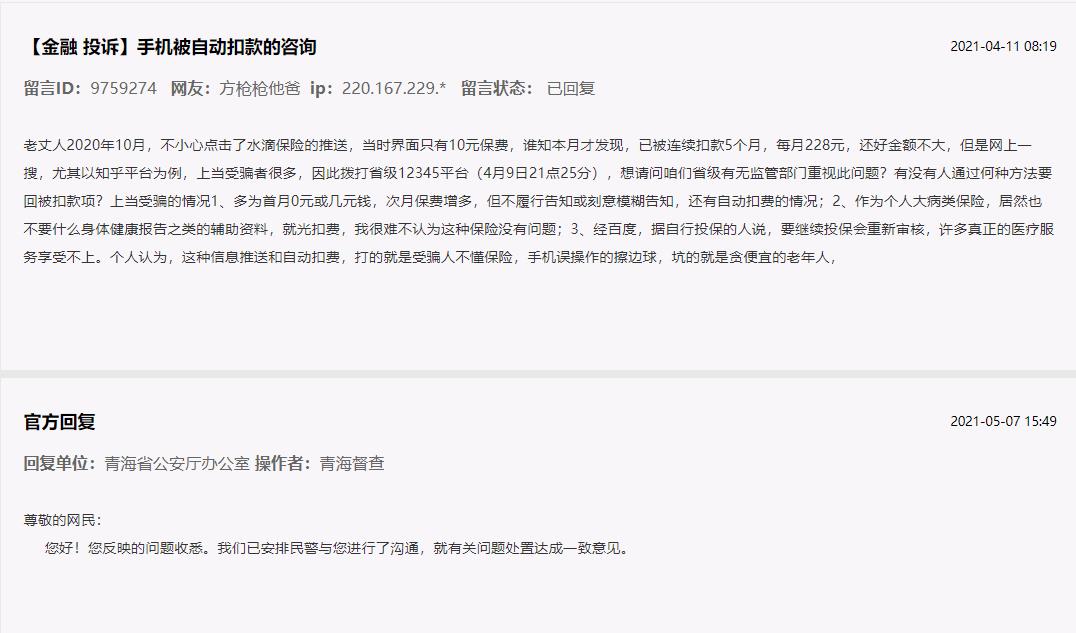 “2020年10月,家中老人不小心点击了水滴保险的推送,已被连续扣款5个月,每月228元,想请问通过何种方法要回被扣款项?”2021年4月11日,网友“方枪枪他爸”在人民网“领导留言板”留言表示,该保险广告主不履行告知义务或刻意模糊告知,导致家人财产受到损失。