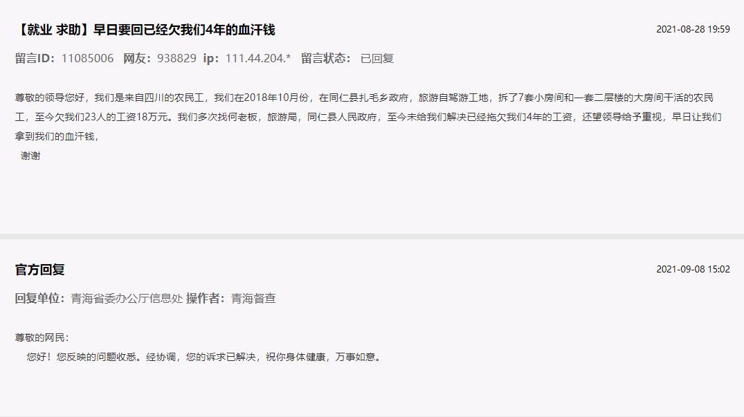 网民留言是社情民意的晴雨表,也是民心向背的风向标。2021年8月28日,网友“938829”留言表示,自己与工友于2018年10月在青海省黄南州同仁县一工地施工,23位农民工工资共计18万元,一直被拖欠。群众利益无小事,青海省委办公厅在核实留言后,及时与当地劳动部门以及施工方沟通,留言11天后,拖欠4年的工资终于发放到了农民工手里。