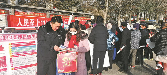 民警向群众发放“110”宣传品。青海省公安厅供图