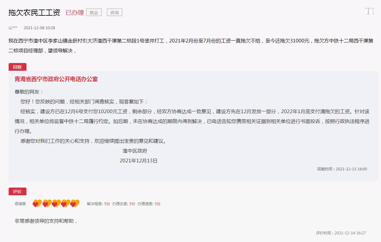 青海省西宁市政府公开电话办公室回复,经核实,建设方已在12月6号支付您10200元工资,剩余部分,经双方协商达成一致意见,建设方先在12月发放一部分,2022年1月底支付清拖欠的工资。针对该情况,相关单位将监督中铁十二局履行约定。如后期,未在协商达成的期限内得到解决,已电话告知您携带相关证据到相关单位进行书面投诉,按照行政执法程序进行办理。随后,该网友也作出满意回复。