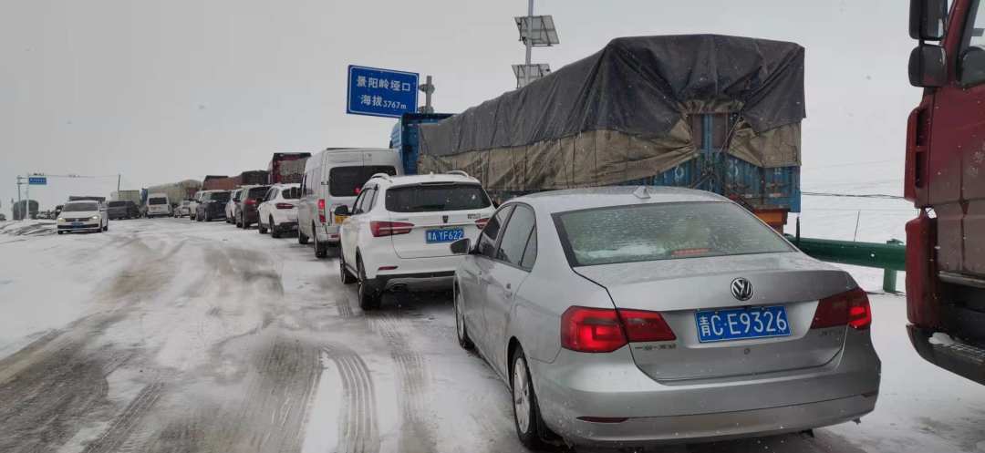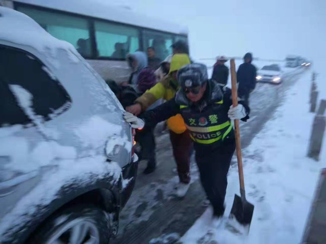 2019年10月5日下午,团团乌云密布在峨堡上空,多年的经验告诉宋维胜,估计有的忙了。带上铁锨、锥桶,穿上棉衣棉裤,宋维胜和同事们径直赶往海拔3767米的景阳岭垭口——情况比想象的还要严重,这是一段海拔较高、落差较大的山口,当时已经开始积雪结冰,双向上行的车辆都遭遇打滑,无法前行。很快,车队就堵得看不到头,车流一动不动。没走多久,警车也被堵住了,没办法,宋维胜和同事们只能弃车,徒步前行。走了快一个小时,终于赶到垭口所在的关键堵点。