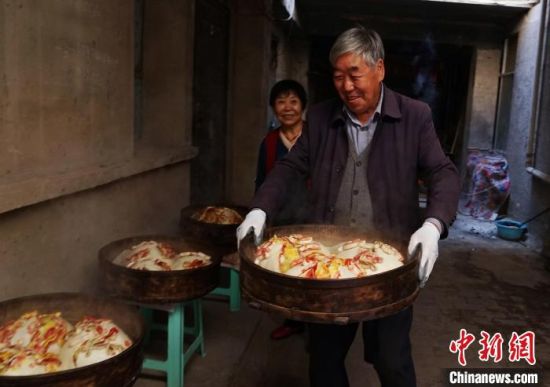 图为何秀兰(后)与老伴刘世功(前)端出蒸好的青海传统蒸笼月饼。 马铭言 摄