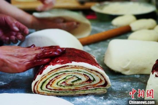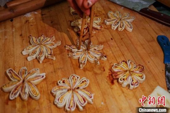今年已经72岁的何秀兰熟练地将发酵好的面摊开,倒上适量清油,再逐层撒上色香具备的香豆、芝麻、姜黄、红曲、藏红花等材料,涂抹均匀,再用擀面杖均匀摊开,然后反复折叠,团成面团,一层叠一层,不仅美观,还美味。“如果爱吃甜的可以加一些白糖,也意味着生活甜甜蜜蜜。”