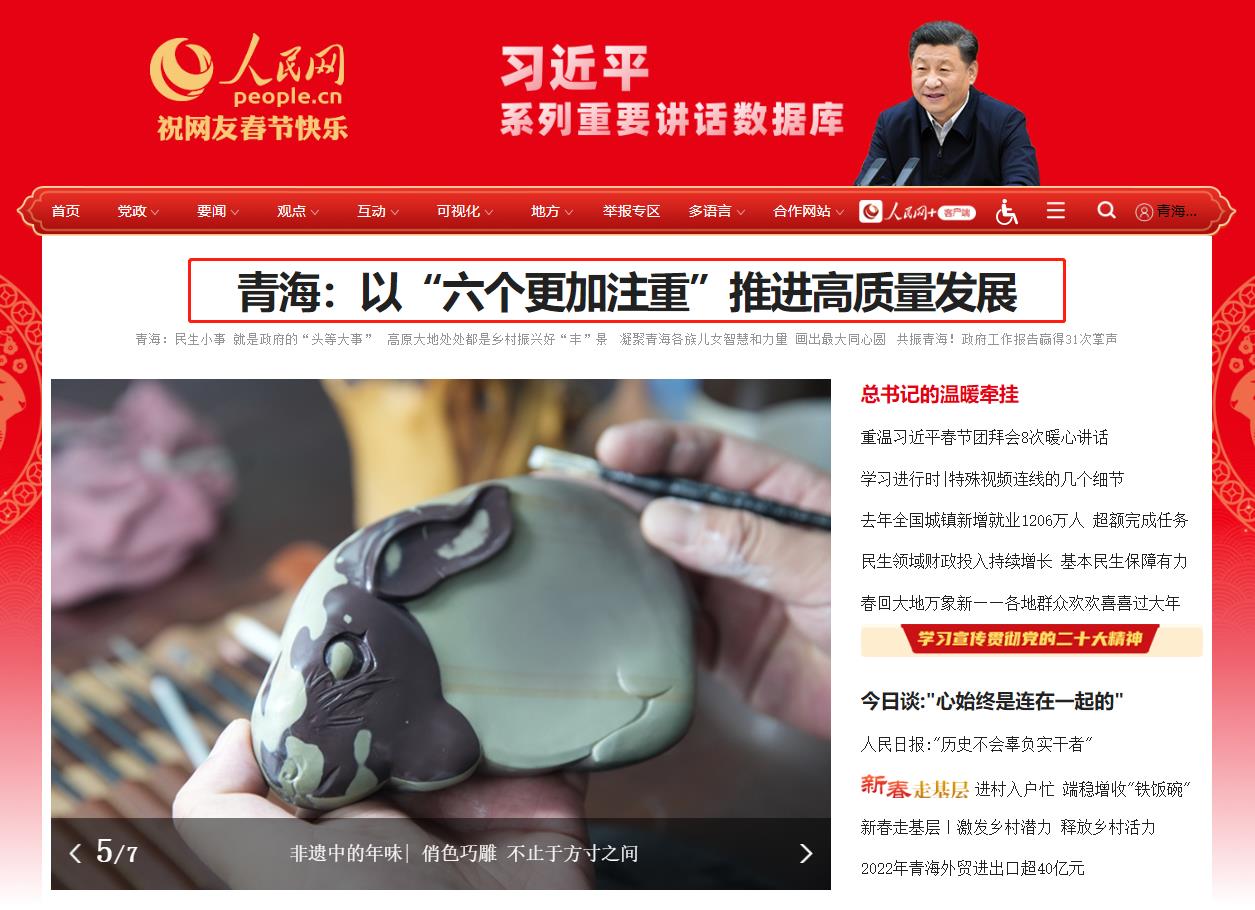 人民网西宁1月22日电 (刘沛然)1月22日,农历大年初一,人民网全国首页聚焦青海,刊发了稿件《青海:以“六个更加注重”推进高质量发展》。稿件以高质量发展为主线,聚焦青海生态保护、民生福祉、民族团结及守正创新,报道了2023年青海省两会成就及未来规划,反映了奋力谱写全面建设社会主义现代化国家青海篇章的不懈努力与积极作为。
