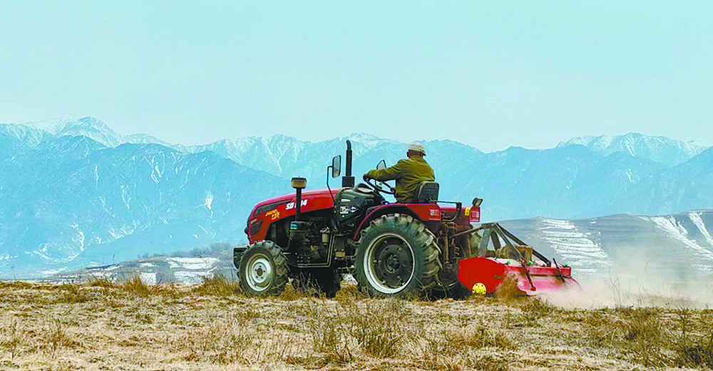 民和回族土族自治县李二堡众联种植合作社的农户正在机械化犁地。青海日报记者 王臻 摄