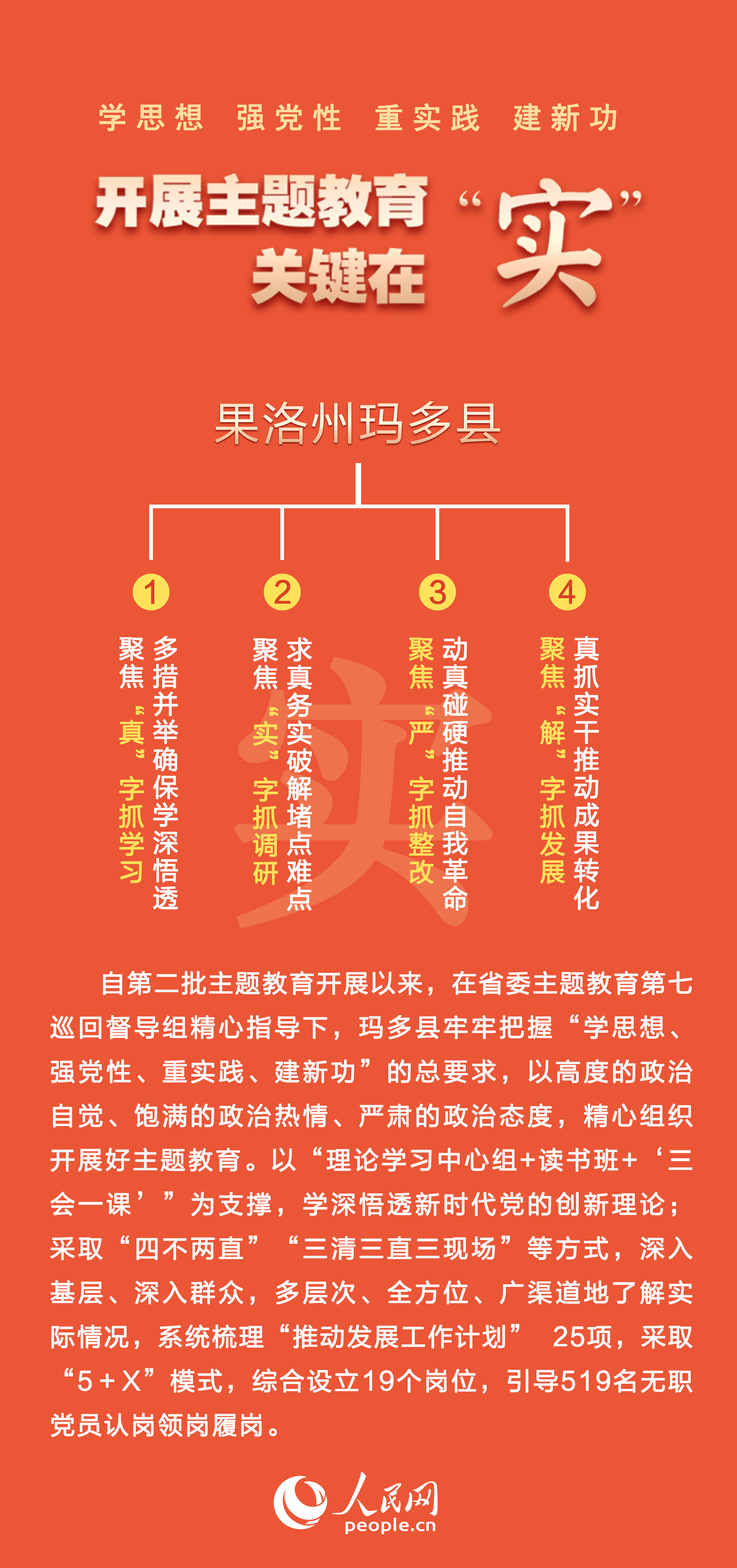 为深化学习成效,玛多县26名县处级干部分批次开展专题研讨,谈认识体会、找差距不足,实现理论学习入脑入心。指导各支部开展“一月一课一片一实践”主题党日活动,引导广大党员干部不断提高履职尽责的能力和水平。