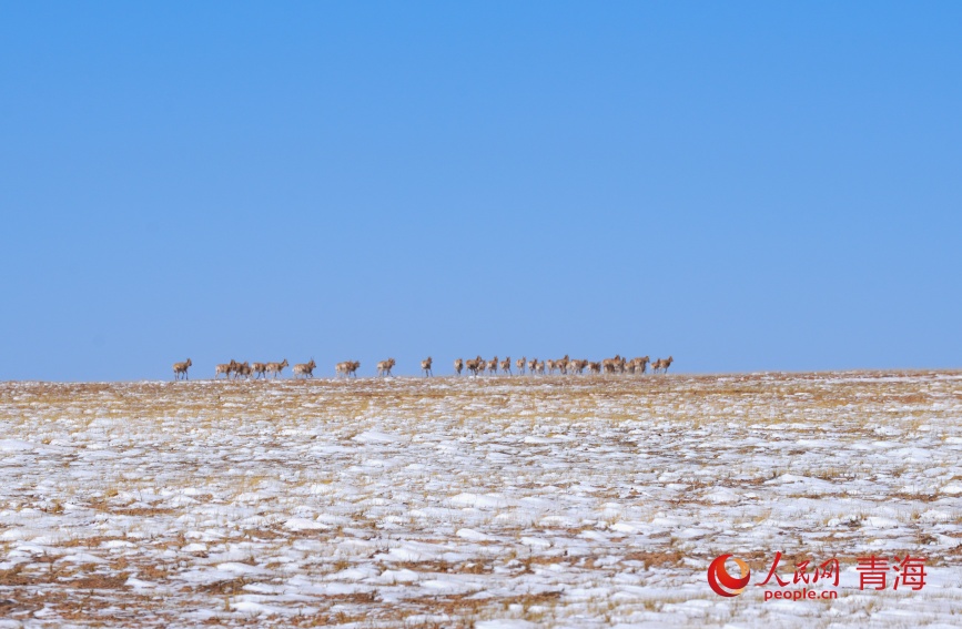 一群藏羚羊在雪中觅食。人民网记者 甘海琼摄