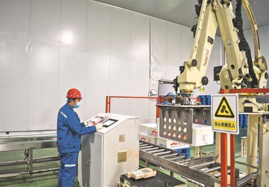 龙洋知鲜机械臂抓取三文鱼货箱。