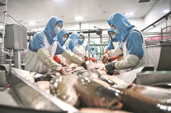 “为了最大限度保留鱼的这口鲜,企业从出水到运送,每个环节都在抢时间、拼速度。”龙洋知鲜(青海)股份有限公司技术运营部部长李明瑞,指着自动化吸鱼泵将一尾尾银光闪烁的三文鱼送上加工台。他的身后,工人正紧张有序地作业。