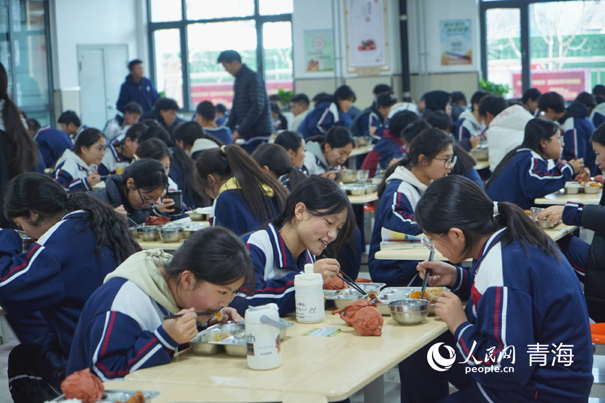 果洛西宁民族中学学生在食堂就餐。人民网记者 甘海琼摄