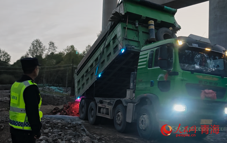 湟源县交通执法人员对车辆进行规范引导,保障运输作业的现场安全。人民网 马可欣摄