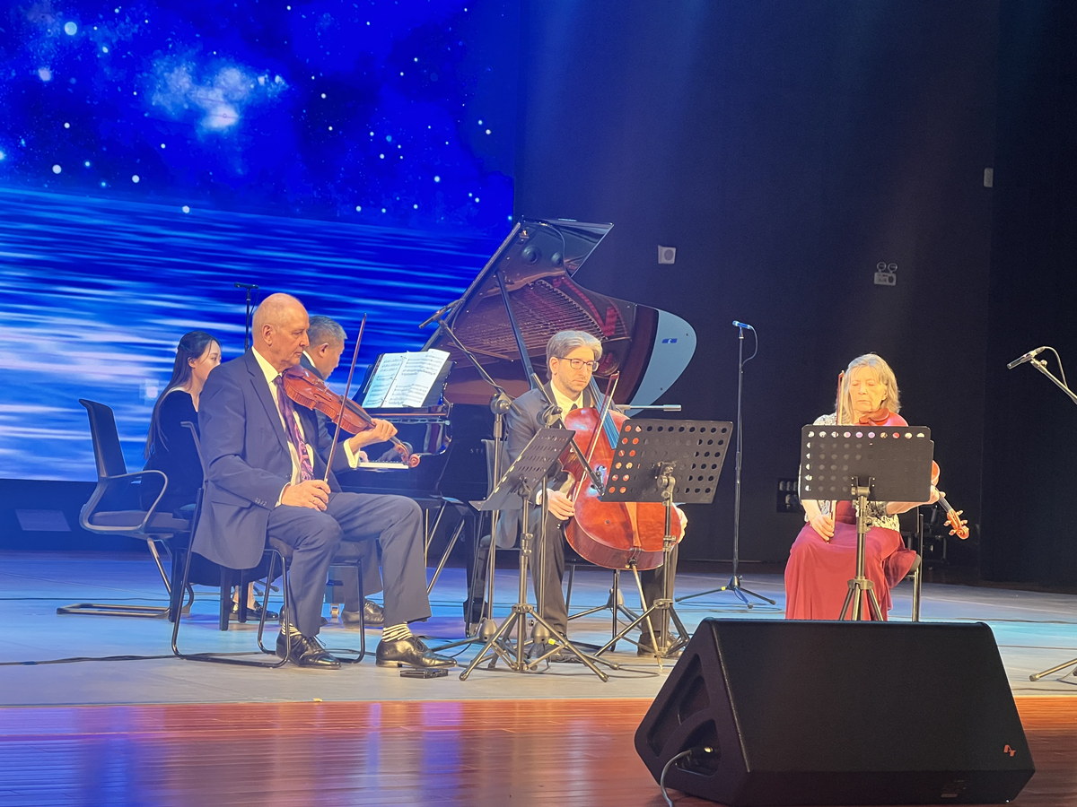 音乐会特邀知名钢琴家潘洵先生现场演绎,同时邀请布加勒斯特埃尔国际室内乐团(含外籍演奏家)同台献艺,为观众带来了一场中西交融的音乐盛宴。演出曲目精心划分为“国际经典、中国传统、本土联动”三大类,既囊括了肖邦、莫扎特等音乐大师的经典钢琴曲,也融入了饱含中华韵味的传统民乐改编曲目,更有展现青海本土文化风情的原创音乐作品。指尖流淌的琴音与乐团的合奏相得益彰,外籍演奏家的精湛技艺与本土艺术元素的鲜活碰撞,让现场观众沉浸式感受不同文化碰撞的艺术魅力,掌声与欢呼声贯穿整场演出,现场氛围热烈而温馨。