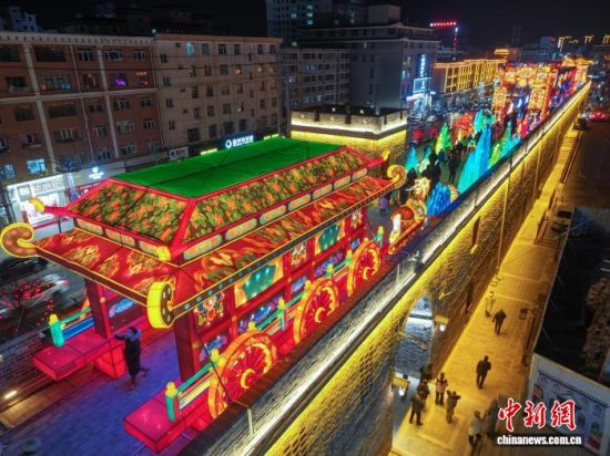 图为航拍“宁宁协作·合源和美”第三届青海丹噶尔双宁双灯展暨第40届中国·秦淮灯会丹噶尔古城分会场内,灯彩璀璨。(无人机照片) 马铭言摄