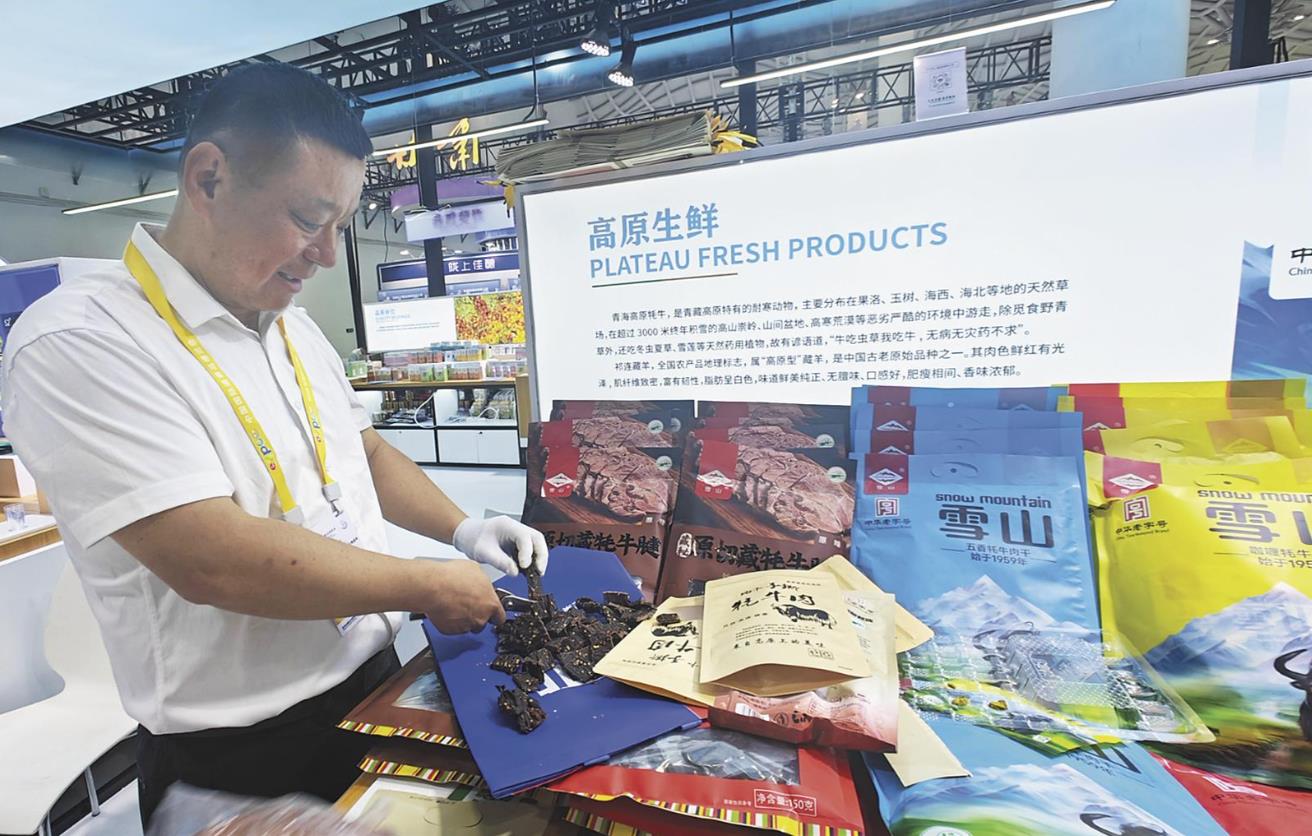 在消博会开展第三日,青海展区内一片片琥珀色的优质咖喱牛肉干被摆上展台,慢烤手撕牦牛肉和原切藏牦牛腱也成为焦点,以保持牛肉原汁原味且浓香鲜美的特点,成为青海优质名牌食品,与其背景墙上的阿尼玛卿雪山摄影作品相映成趣。来自广东的采购商陈女士尝过中华老字号、青海老字号雪山牌牦牛肉干后,当场下单,买来给亲朋好友尝鲜。