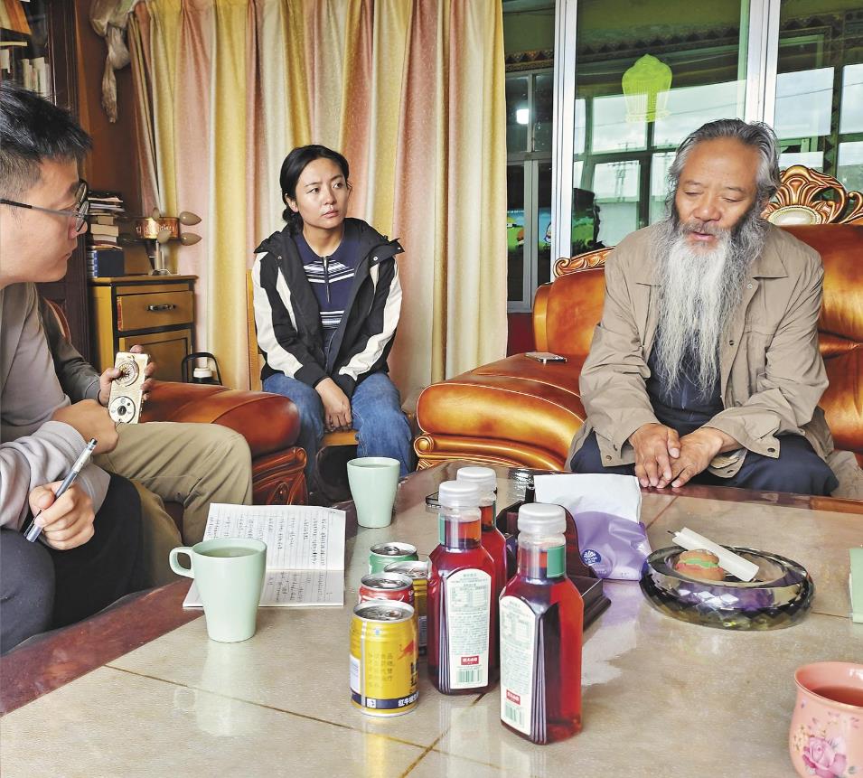 文才家住青海省玉树藏族自治州治多县文化馆附近,走进院子,阳光洒在修剪整齐的草坪上,中央那一顶帐篷格外醒目。“欢迎来我家做客,老师们请坐,我给你们倒茶。”文才热情地迎了上来。他用流利的普通话与我们交流,长长的白胡子和睿智的眼神,散发着文人气息。