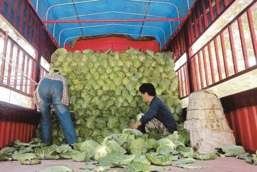 远远望去,成片的菜地绿意盎然,工人们忙着采摘地里的甘蓝。“装满一车,我们几个人就能赚1000元,我们一天能装4车。”说到工钱,工人们喜上眉梢。