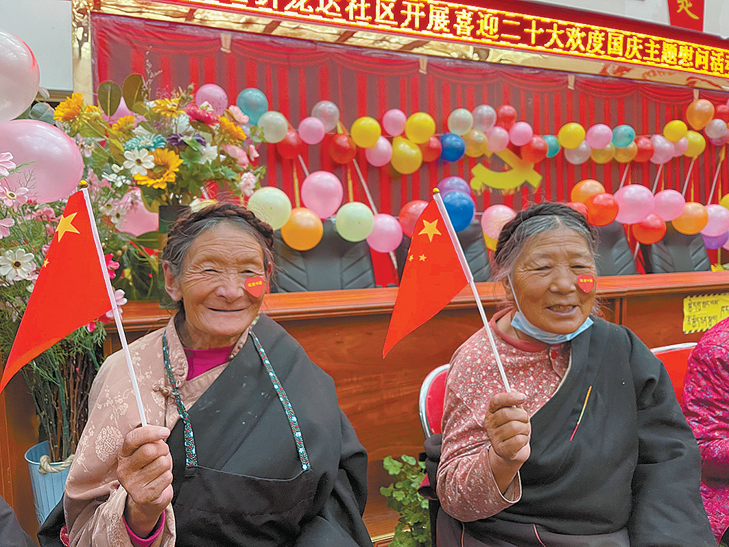 “五星红旗迎风飘扬,胜利歌声多么响亮……”玉树藏族自治州玉树市结古街道折龙达社区的活动室内,社区志愿者和老人们身着盛装欢聚一堂,大家脸上洋溢着幸福的笑容,用歌声齐祝共和国“生日快乐”。